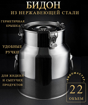 Бидон из нержавейки объемом 22 л "Виномастер" предназначен для длительного хранения пищевых жидкостей (воды, масел, соков, алкогольных напитков) и сыпучих продуктов (круп, орехов, семечек, сухофруктов). Может использоваться в качестве емкости для брожения.