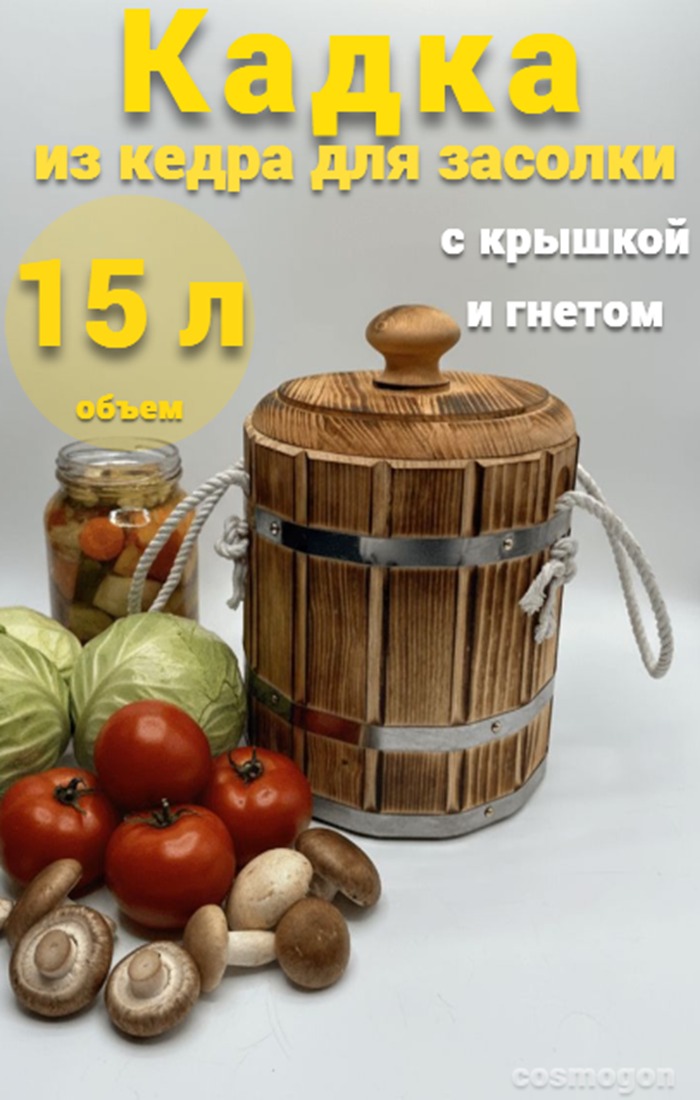 Кадка из сибирского кедра 15 л предназначена для засолки овощей, фруктов, грибов, рыбы и т.д. Древесина кедра содержит вещества, которые придают соленьям особый вкус и аромат. Экологически чистая тара. Сделано в Сибири. Сделано с любовью.
